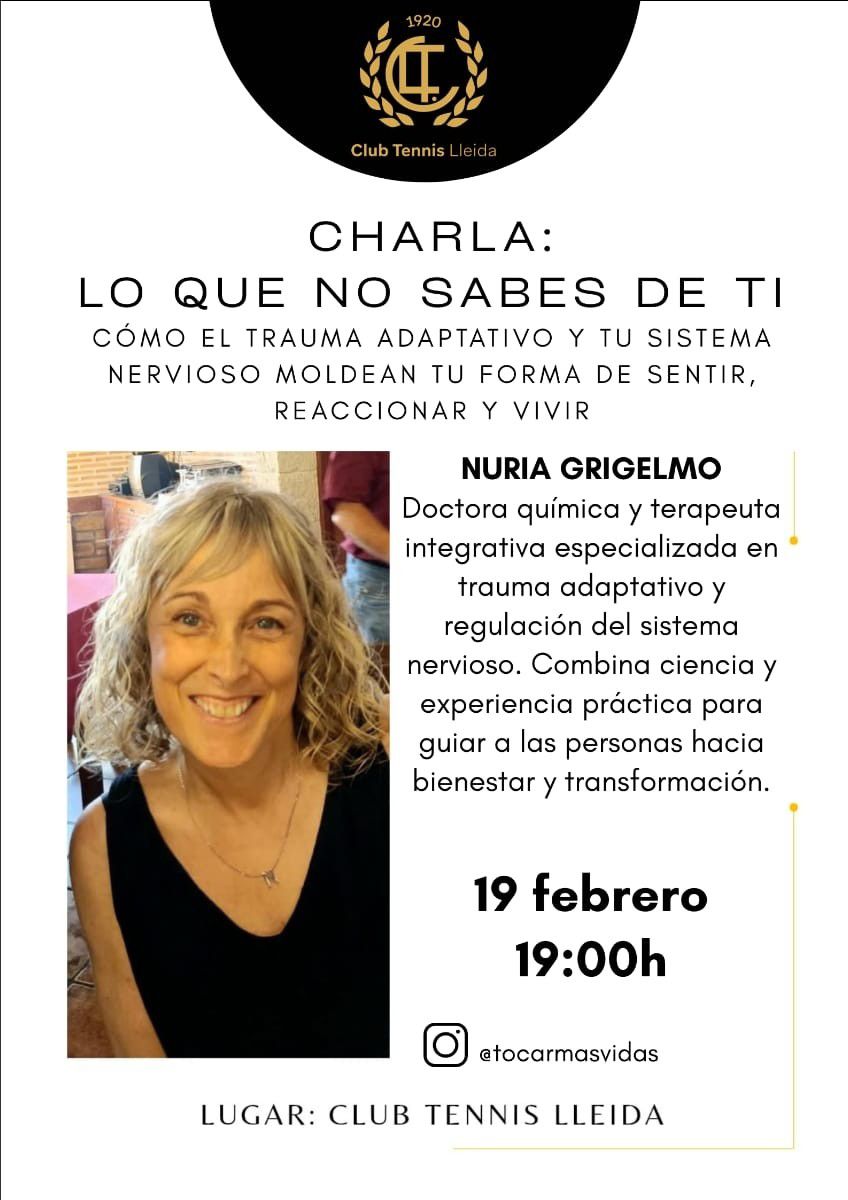 El passat 19 de febrer, al Club Tennis Lleida vam tenir el plaer d’acollir la conferència de Núria Grigelmo, doctora en Química i terapeuta integrativa especialitzada en trauma adaptatiu i regulació del sistema nerviós, sota el títol ‘Com el trauma adaptatiu i el teu sistema nerviós modelen la teva manera de sentir, reaccionar i viure’.